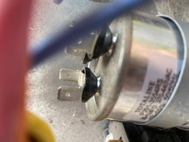 Residential demand emergency service on a carrier Heat Pump air conditioning system. the capacitor is bad. You can see by the bubbling on the top. bad capacitor had caused the fan motor to go bad. Replacing both fan motor and capacitor