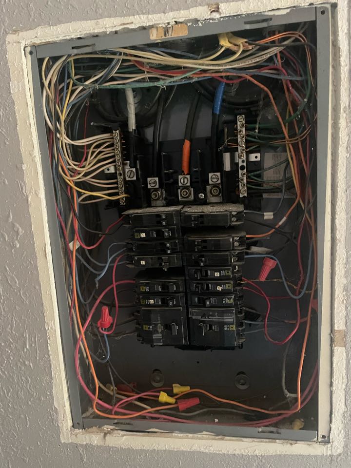 This breaker panel has more code violations than I care to count. We are replacing it and updating