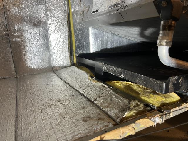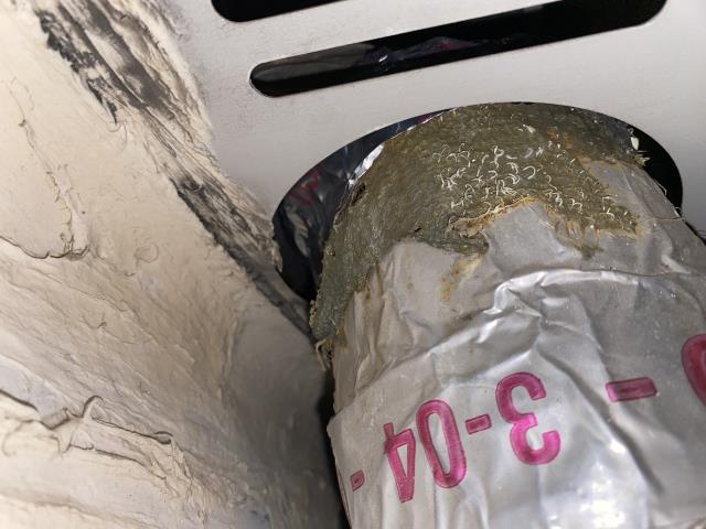 Preforming annual maintenance on a Carrier heat pump HVAC system. This metal ductwork looks good on the outside, but there is a lot of growth in the inside