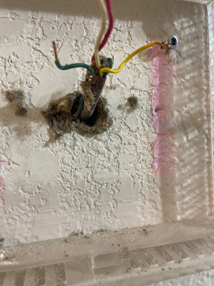 Where the thermostat for the air-conditioning system was. The hole behind it is covered in dust. This is because the house is very leaky. This causes a significant indoor air quality IAQ problem